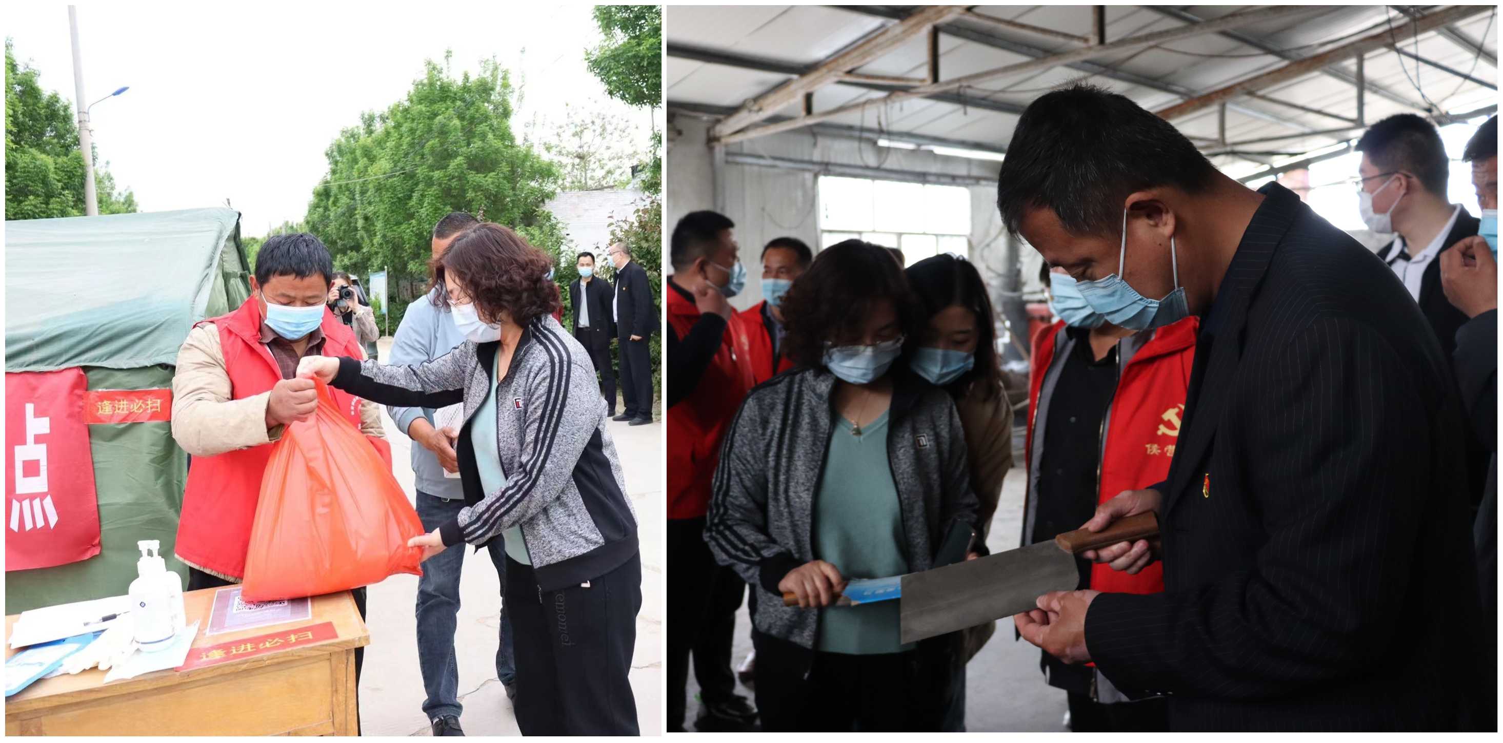 隨后,楊震一行來(lái)到何屯村疫情防控點(diǎn),開(kāi)展疫情防控知識(shí)宣傳并捐獻(xiàn)防疫物資,在村委書(shū)記王鴻剛的陪同下參觀了德鑫齋刀場(chǎng)。