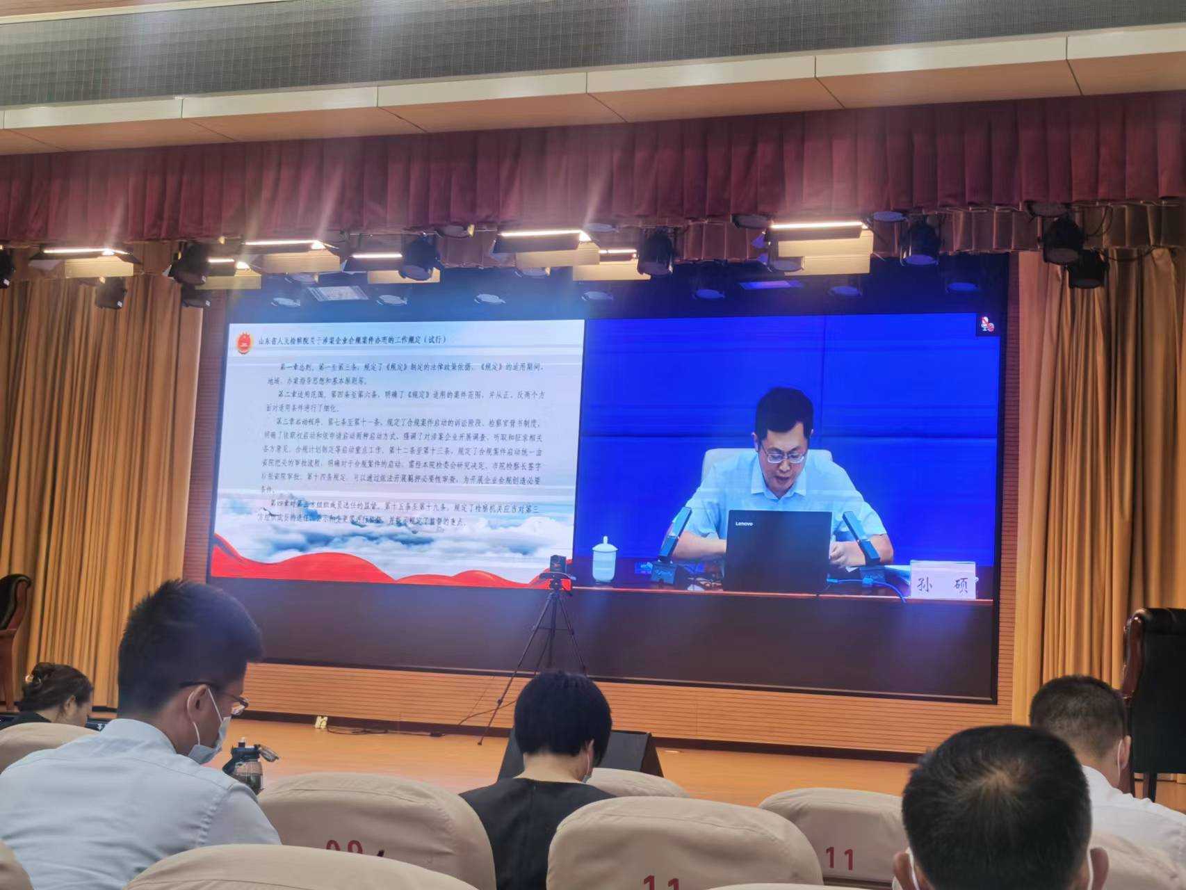 本次培訓(xùn)由山東省人民檢察院第四檢察部孫碩同志解讀《山東省人民檢察院關(guān)于涉案企業(yè)合規(guī)案件辦理的工作規(guī)定(試行)》及辦理案件有關(guān)標準,強調(diào)辦理企業(yè)合規(guī)案件應(yīng)當(dāng)以習(xí)近平新時代中國特色社會主義思想為指導(dǎo),深入貫徹落實習(xí)近平法治思想,堅持講政治原則,堅持依法辦理原則,堅持審慎穩(wěn)妥原則,堅持質(zhì)量優(yōu)先原則,堅持職權(quán)法定原則,實現(xiàn)司法辦案政治效果、社會效果和法律效果的有機統(tǒng)一。